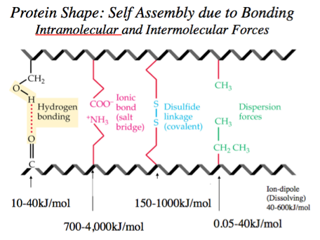 H2N- on the left and on the right -COOH• 2o (secondary): Structures which include, folds, turns, alpha-helices, and beta-sheets held in place by hydrogen bonds.