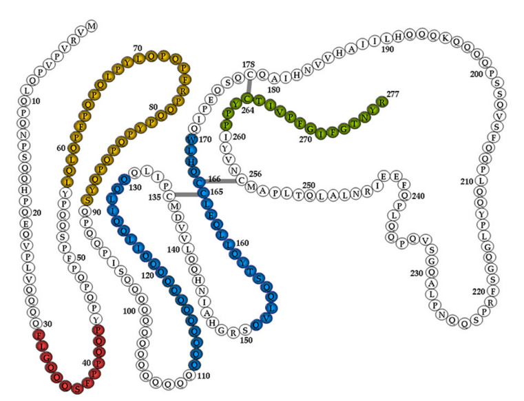 - What is the % of hydrophilic amino acids in the total number of amino acids of the following gliadin string? Show your calculation.