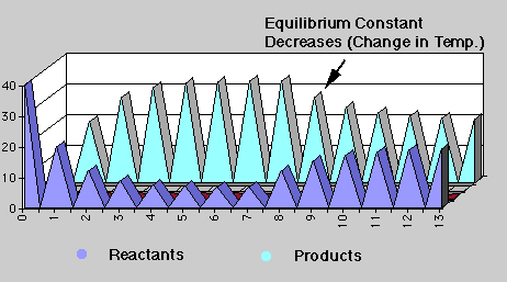 There are thirteen points in time or "events" where simultaneous transfers from reactants --> products and products --> reactants occur. The percent of the transfers are fixed at 50% and 10% respectively in "events" 0-6 (set one) and equal to 20% in "events" 7-13 (set two). Notice the graph. Equilibrium is established at "event" 5 for the first set of transfers and at "event 12 for the second set, that is, the amounts of reactants and products are no longer changing.
