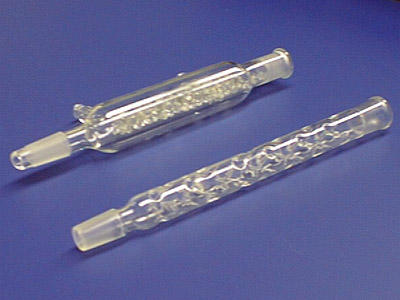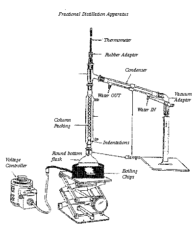 The fractionating columns below are a packed column on the left and a Vigreaux column on the right.
