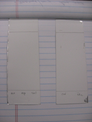 The TLC plates include the 5 reference compounds: #1 on the left = ace, asp, sal; #2 on the right = caf, ibu